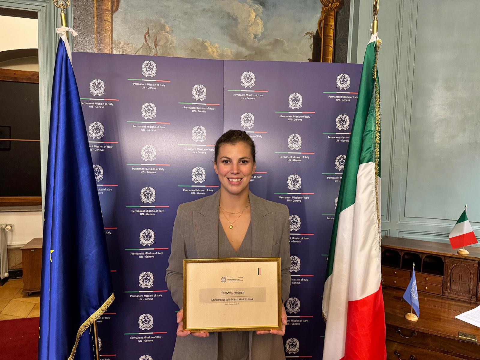 L’Ambasciatore Vincenzo Grassi, Rappresentante Permanente d’Italia presso le Organizzazioni Internazionali a Ginevra, ha conferito a Carola Saletta il titolo di “Ambasciatrice della Diplomazia dello Sport”. Saletta è Junior Professional Officer (JPO) presso il Dipartimento Legale dell’Organizzazione Mondiale della Sanità (OMS) e atleta delle Fribourg Gotteron Ladies e della Nazionale italiana femminile di hockey su ghiaccio, con la quale parteciperà ai Giochi Olimpici Invernali di Milano-Cortina 2026.