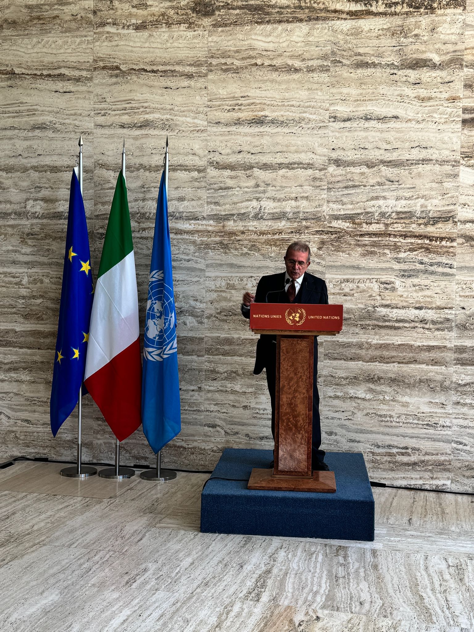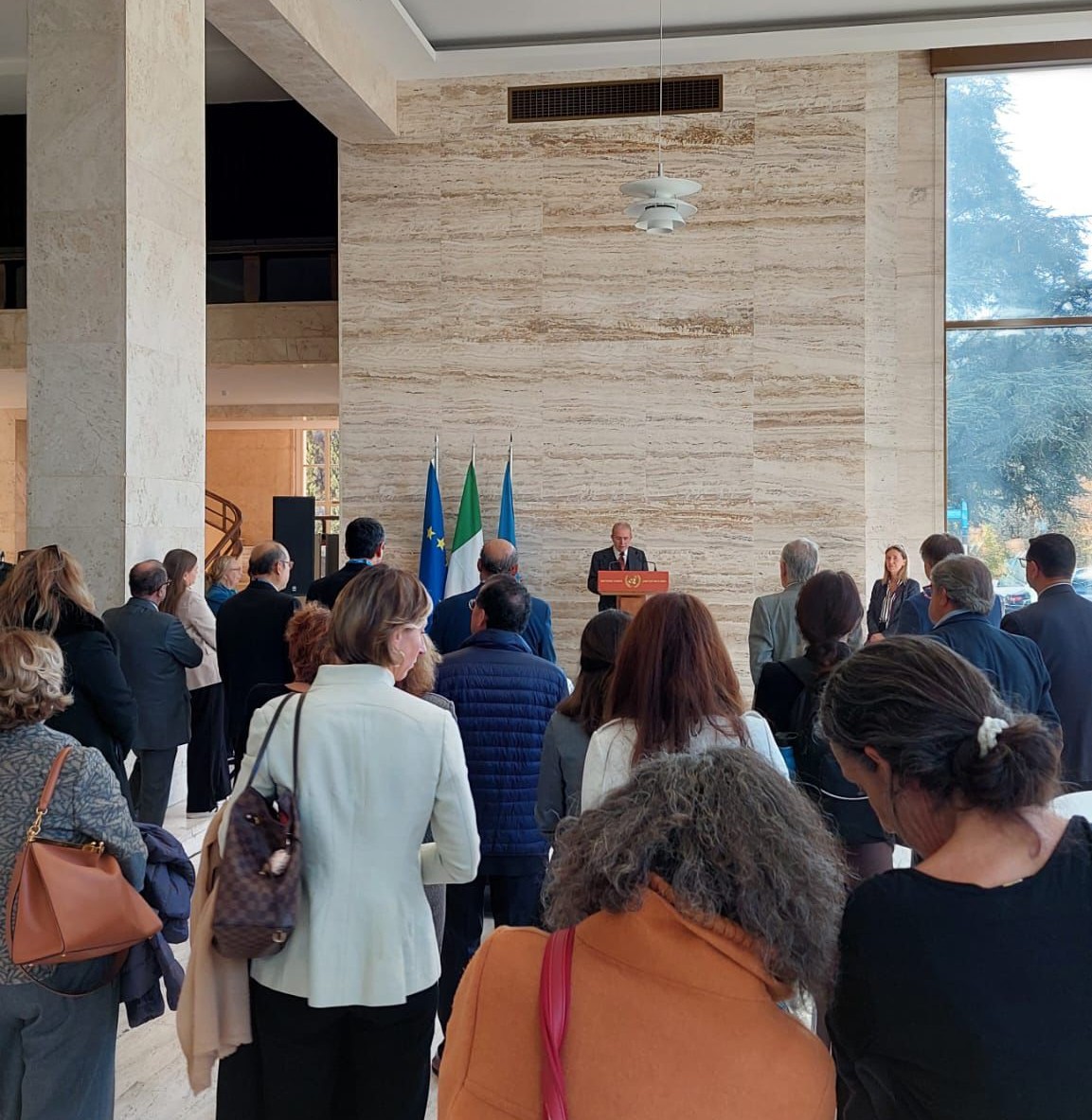 Nel suo intervento, dinanzi a numerosi Rappresentanti Permanenti degli Stati membri e a una folta platea, l’Ambasciatore Grassi ha dichiarato: «Restituire quest’opera nella sua bellezza originaria, in un’area del Palais appena restaurata, costituisce un atto simbolico e al contempo concreto del sostegno dell’Italia al multilateralismo, quale asse portante della politica estera italiana in adesione ai valori della Costituzione Repubblicana” . L’Amb. Grassi ha altresì richiamato la Dichiarazione Universale dei Diritti Umani, aggiungendo: «La protezione e la promozione del patrimonio culturale e dei diritti culturali rientreranno tra le priorità del mandato italiano al Consiglio dei Diritti Umani per il periodo 2026–2028».